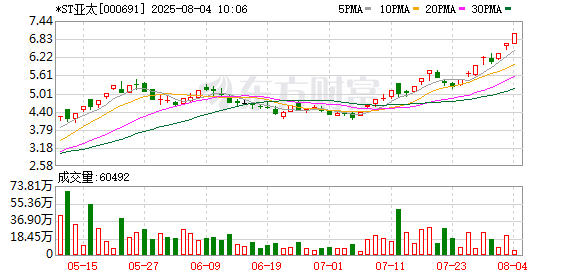 *ST亚太(维权)再度涨停,8个交易日内录得5个涨停,累计涨幅为34.36%,累计换手率为37.04%。截至9:35,该股今日成交量516.06万股,成交金额3534.72万元,换手率1.60%。最新A股总市值达22.63亿元。