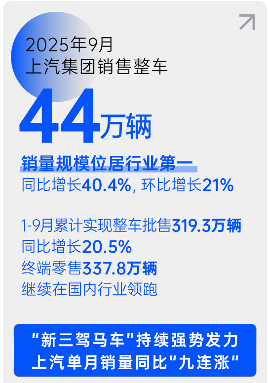 数据显示,上汽9月销售整车44万辆,同比增长40.4%,实现同比九连涨,环比增长21%,销量规模位居行业第一。由上汽自主品牌、新能源、海外市场构成的“新三驾马车”表现尤为出色: